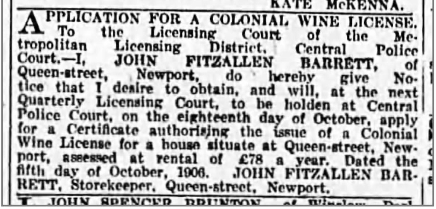 On October 5, 1906, John Fitzallen Barrett, Storekeeper of Queen Street, Newport, applied for a Colonial Wine License.