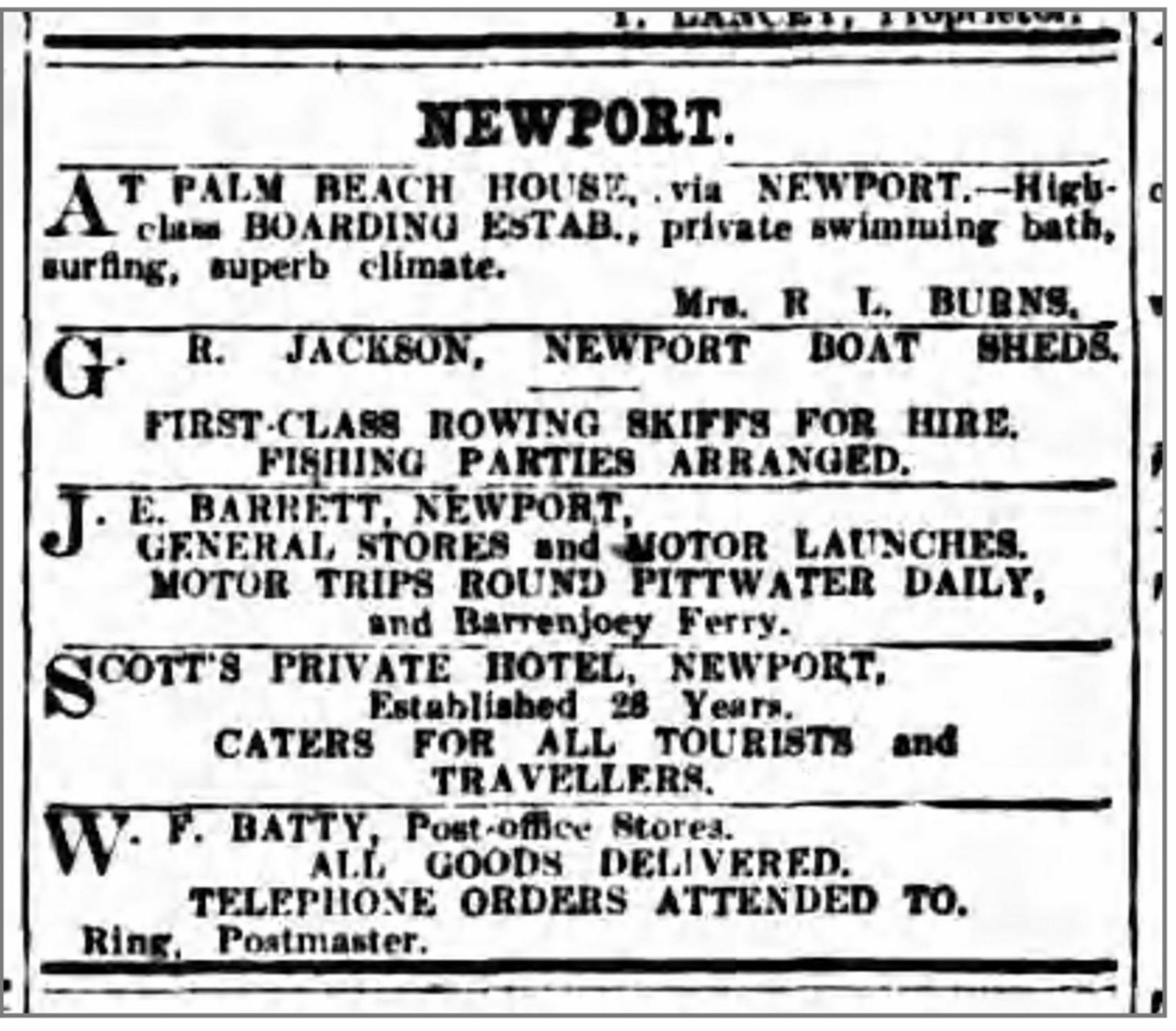 On April 30, 1915, John Ernest Barrett promoted the services his business offered in The Sun newspaper. The services included motorboat hire, a Pittwater and Palm Beach ferry, goods delivery by launch or horse and cart, and furnished cottages for rent.