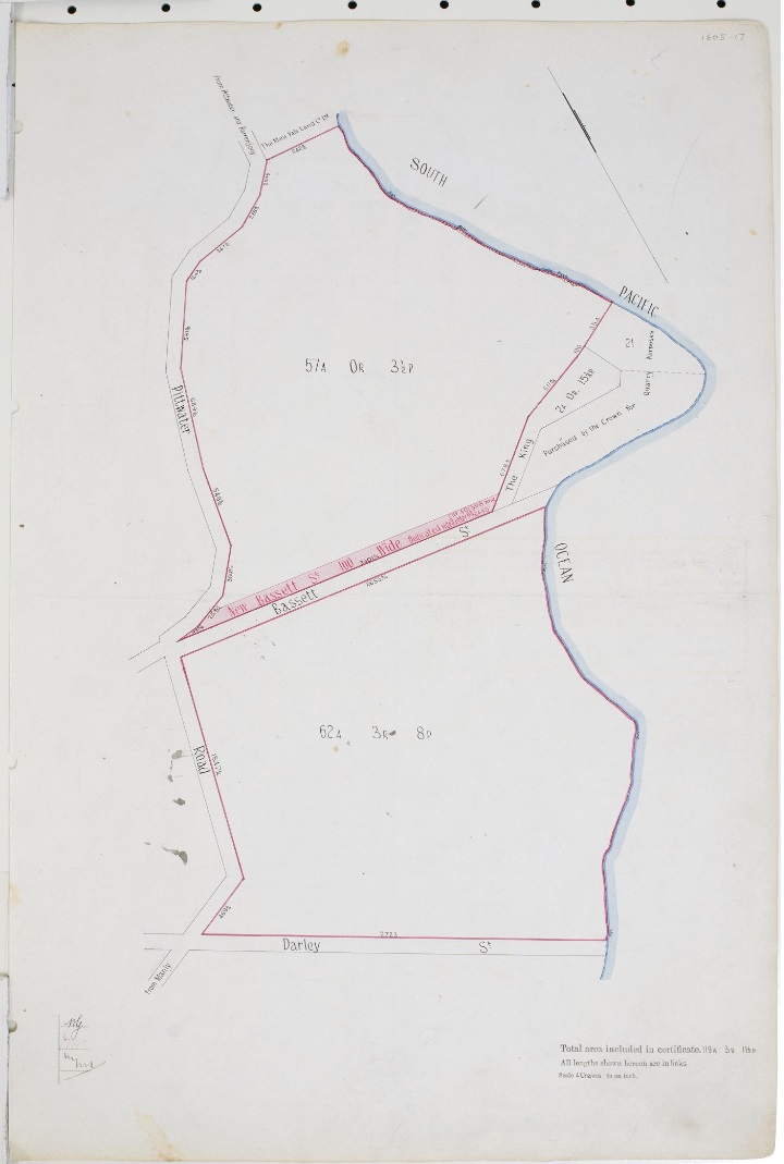 The land was what was left from the Robert Campbell land grant of 700 acres, which was subdivided in part by Pile and Jeanerette to form the New Marine Township of Newport (119 acres), with the residue overseen by George Osborne and Alexander Stuart, Esquires (the trustees of Mrs Bassett's marriage settlement) when the acreage became part of the Bassett-Darley estate.