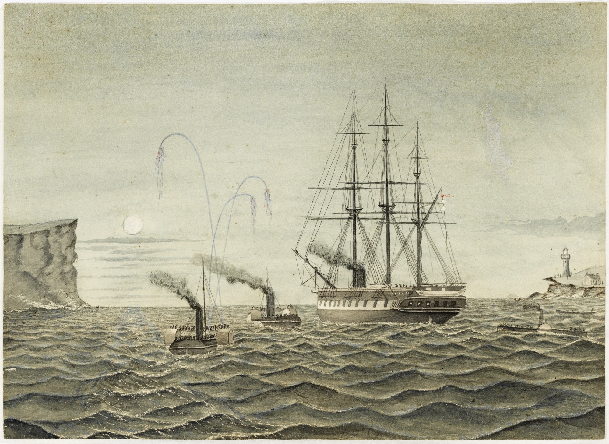 H.M.S. Galatea passing the Sydney Heads with the Pelican and Emu in attendance, ca. 1868
