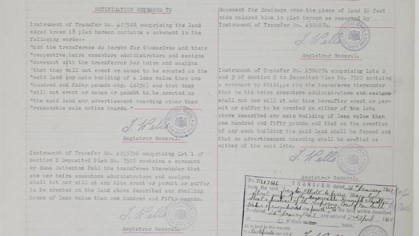 The HRLV Book-No: 826-616, dated December 20, 1897, records Marjory Woodman, wife of William Woodman of Balmain, sells 'for a consideration' of £210 with the residue to be paid to the Bank of New South Wales to extinguish the mortgage held there for the same. Marjory Woodman not only sells the land also included is the 'houses and outhouses, ways and rights of way'.