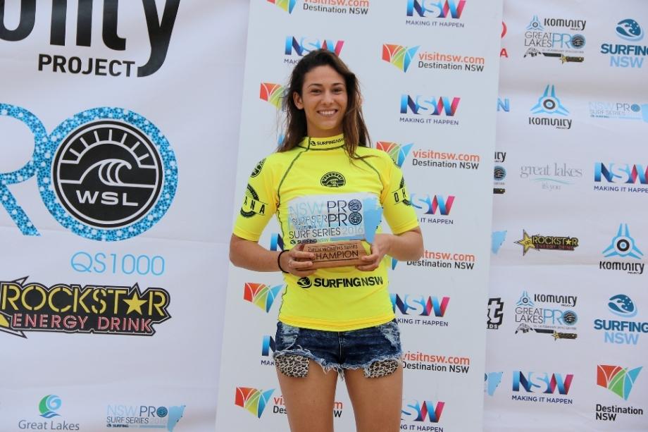 Mikaela Greene (Yallingup, WA) is the overall NSW Pro Surf Series champion after rival and series contender Philippa Anderson was eliminated from the event. Despite both surfers being knocked from the event in round three, Anderson still mathematically needed to claim victory at the Komunity Project Great Lakes Pro presented by Rockstar Energy Drink to claim the overall championship.
