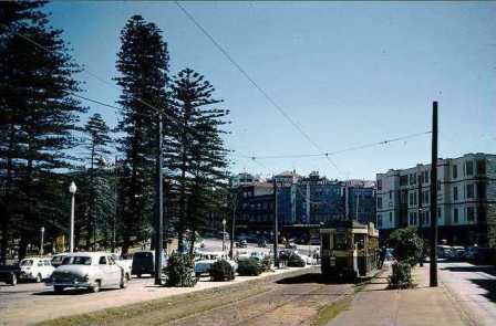 Campbell Parade, Bondi Beach in 1960 with P type tram courtesy SYDNEY TRAM MUSEUM