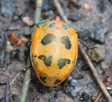 This colourful insect is a member of the Jewel bug family (Scutelleridae) named for their bright metallic colouration. They are also known as Hibiscus Harlequin Bugs and common in Brisbane. This one is a female, which you can tell by her orange colour with small patches of metallic blue scatter over the body. Males are red with metallic blue patches. Their patterns can be quite different between individuals. Males are smaller than the females in size.