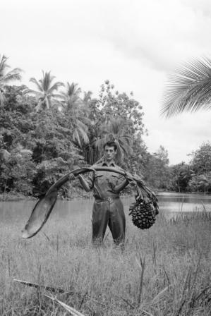 CSIRO botanist Lyn Craven (1945 - 2015) holding a fruiting stalk of a nipa palm (Nypa fruticans), near Ravikivau, Purari River delta, Papua New Guinea, 19 Feb. 1966.© Dick Schodde.