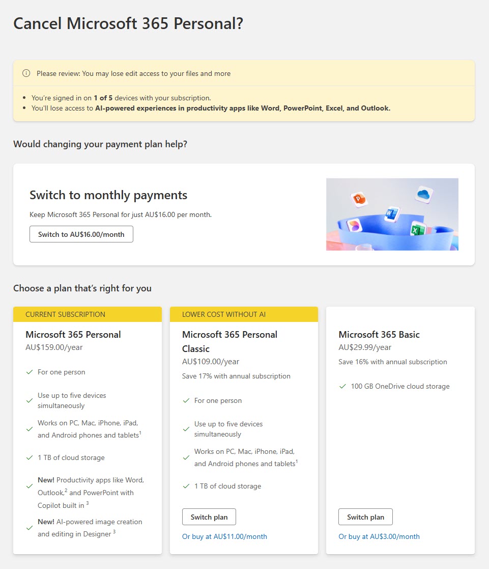 Existing Microsoft 365 Personal and Family subscribers who have not had their subscription renewed since 8 July 2025 and would like to revert to their previous plan may be able to select the cancel option and follow the steps in the cancellation process until the Classic plan is offered. However, the ACCC notes that the subscription options and prices offered are entirely in Microsoft’s control and could be subject to change at any time.