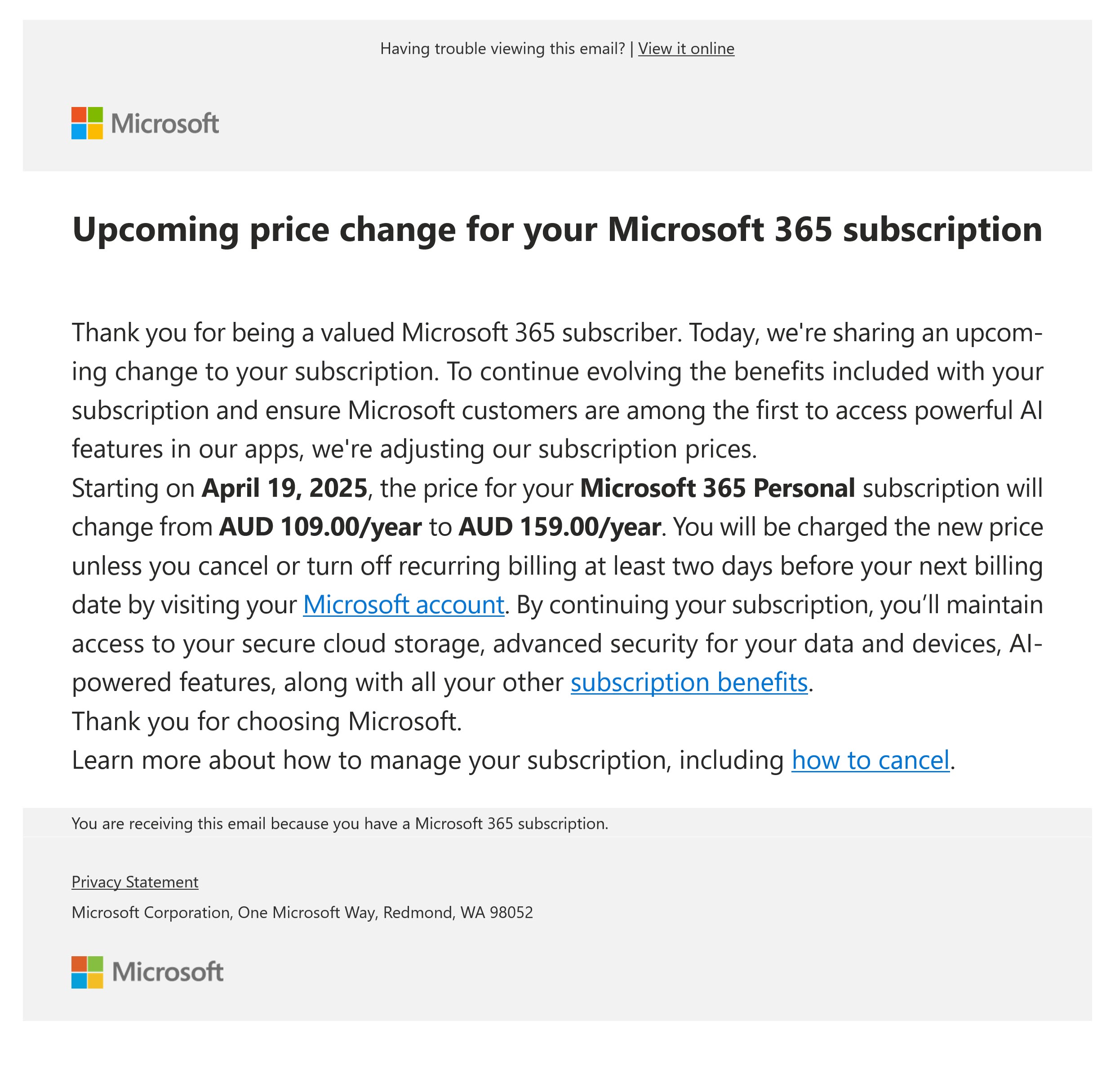 “We want to let you know about a change to the amount of your next payment. Unless you cancel two days before Saturday, April 19 2025, we’ll charge AUD 159.00 including taxes every year… We’ll tell you if this price ever changes. Cancel any time to stop future charges or change how you pay by managing your subscription in your Microsoft account.”