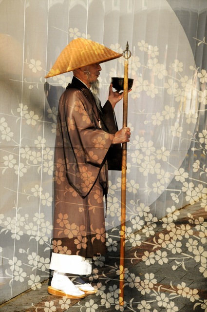 The monk’s woven fibre hat is worn to partly cover his face during the alms ritual, or takahatsu, so that neither he, nor those giving food or money, see each others' faces. This represents the perfection of giving. One can also see the monk's plain white kimono under the brown outer cotton or linen robe, called a koromo. What cannot be quite appreciated is the monk’s silent dignity within the hubbub of Tokyo’s urbanity. A layered cherry blossom pattern suggests the monk’s stoic inner calm.