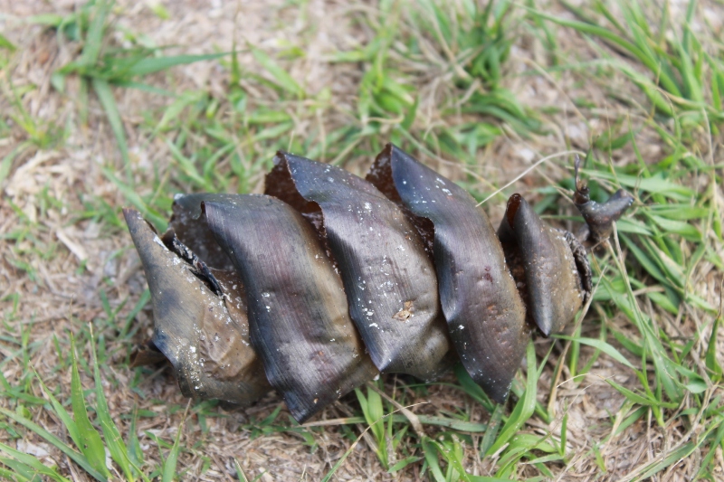 These half arc crescent- jelly like objects are actually the egg sacs of Sand Snails. There are a few species of Sand Snails common in our area. The Conical Sand Snail (Polinices conicus) is a honey-coloured, pear-shaped shell with a brown or orange band along the top of each whorl. It grows to 42mm and is found on sand flats of sheltered beaches and estuaries. Polinices incei grows to about the same size but varies in colour and is rounder. The Sordid or Leaden Sand Snail (Polinices sordidus) prefers the more muddy conditions of estuaries. Its shell, which grows to about 36mm, varies from grey to brown with an orange outer lip. (3.) Sand snails lay their eggs in these kidney-shaped egg jellies, sometimes called ‘horseshoe jellies’. If you hold them up to the light you will see spots inside which are the tiny eggs. This one was photographed on the mudflats of Careel Bay in 2009.