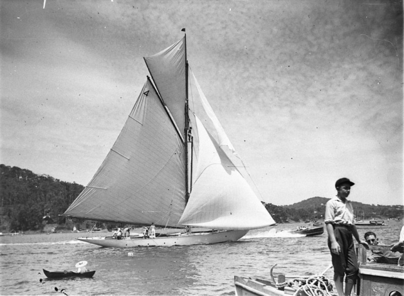 Yacht "Morna" rounding the buoy: Crewman up on halyard at Pittwater Regatta. Photo by Sam Hood, Jan 1st, 1934 - courtesy State Library of NSW