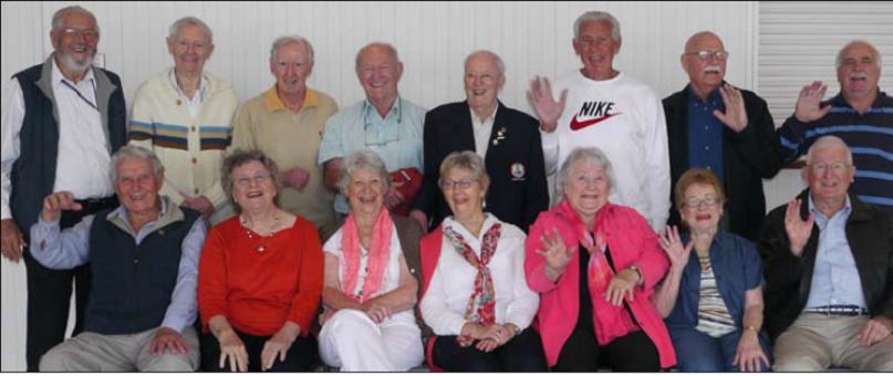 Top row: Ken Davidson, Ian Gorrie, Kevin Watt, Reg Wood, Don Imison, Ron Handley, Bob Head, Dennis Casali. Bottom row: Max Watt, Joan Watt, Marj Wood, Beryl Imison, Norma Watt, Mr and Mrs John Cameron