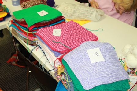 This year, the fifth year Mona Vale Library has hosted Pittwater’s own annual Knit In, providing a yummy morning and afternoon tea, the Pittwater Stitchers, a group of ladies who either knit, sew or crochet every Friday at Mona Vale Library (10am -12) were a little busier then usual. Piles of colourful squares were stacked on tables, crochet hooks, knitting needles and those who are skilled with thread and needles toiled happily at all tables. While we were visiting the ladies one local supporter dropped off a whole ‘wrap’ ready to be finished by being sewed to a backing piece.