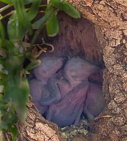 The nest. One practising “moves like Jagger”. Eyes, ears and wing visible.