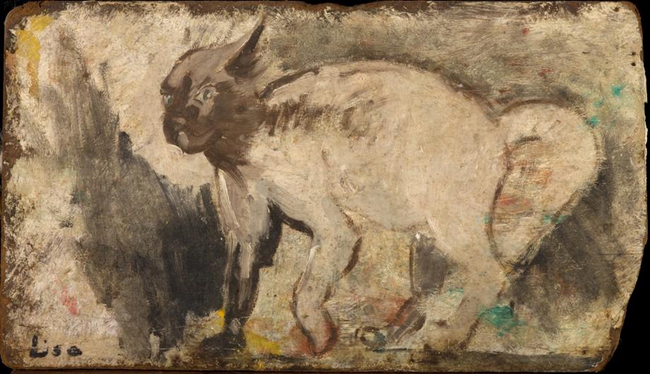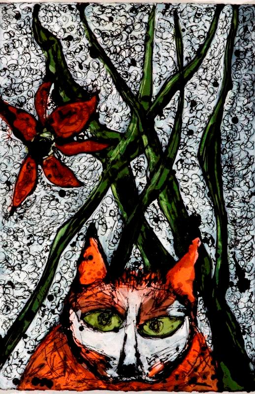 I like putting stuff into the work – so this one has sand in it. These are termed ‘mixed media’. I do installations, woodblocks and prints from these – this was a series called ‘Crazy Cat’.