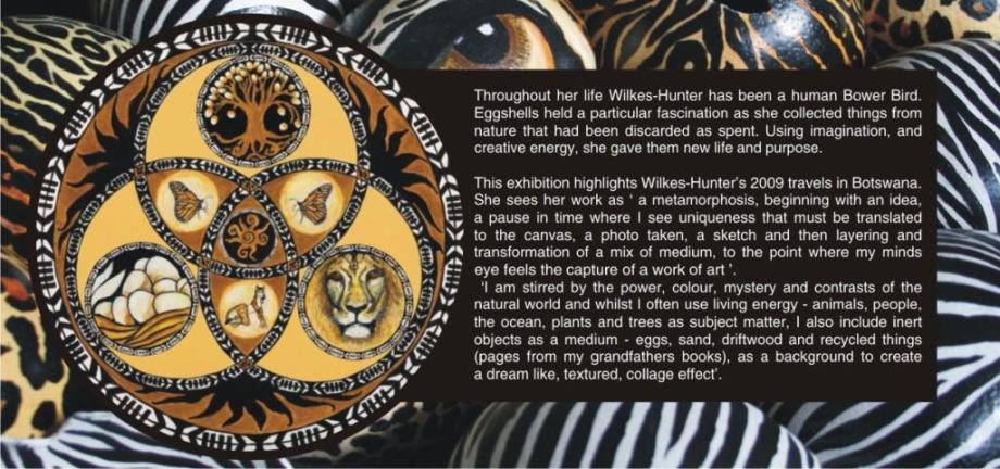 One of my paintings is this Mandala – I use this as an inspiration for all my works still - this is my story. In here is me wanting to go to Africa, a lion (and I’m a Leo), these eggs are where I was developing the installations with an exhibition in mind. This is the sunshine, shining on us and this stems from ‘put your face always towards the sunshine and the shadows will all fall behind you’ – the butterflies are Hailey and Tara, my daughters and at the top is the Tree Of Life and that is for us, my daughters and myself, so we will be healthy and sheltered under the Tree of Life. These are the fires, the fires within you and the fires within your life and within each little interconnection is ‘GO’ which is for Greg Oates, my husband.