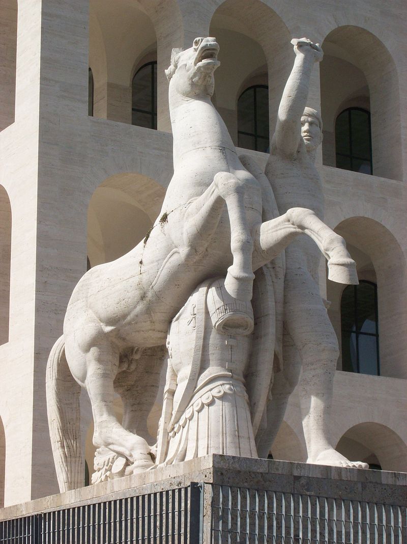 In the arches of the ground floor are 28 statues (6 for the facades towards Viale del Lavoro Civilization and the staircase, and 8 in the other two-sided), each of them allegorical virtues of the Italian people: Clockwise starting from the first to the left of the front of avenue of the Civilization of Labour include the allegories of ' heroism , the music , the' craft , the political genius, the social order, the work , the ' agriculture , the philosophy , the trade , l' industry , the ' archeology , l' astronomy , the history , the inventive genius, the ' architecture , law, the primacy of navigation, sculpture, mathematics , the genius of the theater, the chemistry , the press , the medicine , the geography , the physical , the genius of poetry, painting and military genius. At the four corners of the base are many equestrian statues depicting the Dioscuri , by Publius Morbiducci and Alberto Ferns; the pair of monuments on the southeast side looks towards the avenue of the Civilisation of Labour, on the northwestern side out towards the city from the open side of the hill on which stands the building. The whole complex is located, from the point of view toponomastico, in an area called the Concordia Square.
