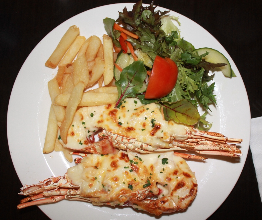 This is a whole lobster, big chunks of meat with a just right mornay sauce, a crisp salad dressed and a few chips to soak up the scrumptious juices with. While we ate ours diner after diner went past with trays loaded with Lobsters – and each plate was left clean.