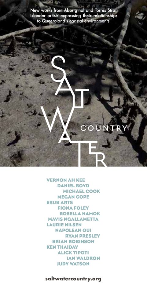 Saltwater Country features celebrated Queensland artists Vernon Ah Kee, Michael Cook, Daniel Boyd, Fiona Foley, Rosella Namok, Mavis Ngallametta, Laurie Nilsen, Napolean Oui, Brian Robinson, Ken Thaiday, Alick Tipoti, Ian Waldron, Judy Watson, and new talents Megan Cope, Ryan Presley and Erub Arts.