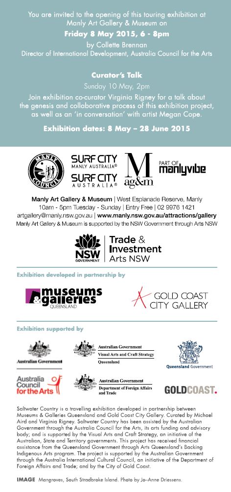 Saltwater Country will be officially opened on Friday 8 May 2015, 6 - 8pm at Manly Art Gallery & Museum by Collette Brennan, Director of International Development, Australia Council for the Arts.
