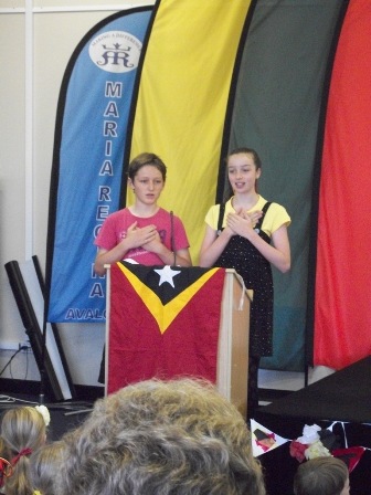 Today Sunday, 20th of May, is the 10th Anniversary of Timor-Leste’s Independence. On Friday the 18th of May, as part of its annual celebrations of its Friendship with the village of Soibada, Maria Regina School, Avalon, held its annual celebration of this day by dressing the whole school and themselves in Timor-Leste’s colours, by reciting prayers and giving presentations to raise the awareness of guests of why they sought friendship agreement with the children in the village of Soibada, and by raising funds to ensure basic needs, such as food, pencils and schoolbooks, can be met. Part of this Celebration is a special assembly to open the day, activities in each class to increase an educational awareness of Timor-Leste(such as learning songs in Tetun), the children consuming the same food their friends in Soibada would for the day and bringing or purchasing crafts made by locals and people from Soibada; funds that will go back into the Pittwater Friends of Soibada’s ongoing projects to self-empower this village.