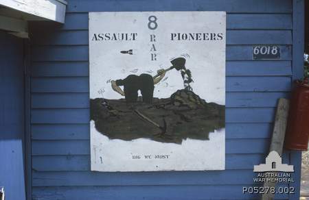 Above: The sign in front of the entrance to the stores building of the Assault Pioneer Platoon (Dig we Must), 8th Battalion, The Royal Australian Regiment (8RAR) at the 1st Australian Task (1ATF) Force Base, Nui Dat. ID NUMBER: P01371.012