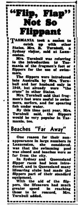 Swim Flippers: "Flip, Flap" Not So Flippant. (1951, February 23). The Mercury(Hobart, Tas. : 1860 - 1954), p. 16. Retrieved from http://nla.gov.au/nla.news-article27012336