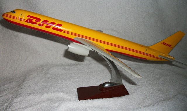 Advertising Version DHL G-BIKM - Boeing 757-236(SF) ; The Boeing 757 is a mid-size, narrow-body twin-engine jet airliner that was built by Boeing Commercial Airplanes from 1981 to 2004. The twinjet has a two-crew glass cockpit, turbofan engines, a conventional tail, and for reduced aerodynamic drag, supercritical wings. Designed to replace the three-engined 727 on short and medium routes, the larger 757 can carry 200 to 289 passengers for up to 3,150 to 3,900 nautical miles (5,830 to 7,200 km), depending on variant. The 757 was developed in tandem with the larger wide-body 767, with shared design features allowing pilots to obtain a common type rating for both aircraft.
