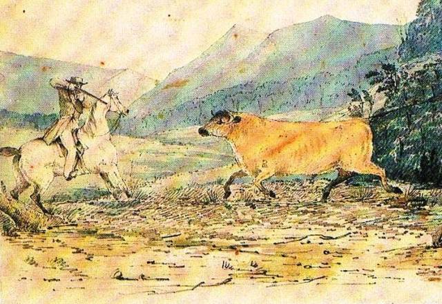 5 Shooting a bull. Watercolour, 'A bush incident' by Abraham Lincolne from his Australian Sketches, c.1838-44. (Courtesy Mitchell Library). Copied from Australians 1838 page 154.