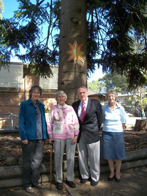 Left to right: Bev Lewis(who has written book on History of MVPS, see below) Margaret Collins, Richard Hoskins AM, and Bev Harvey under the Bunyip pine