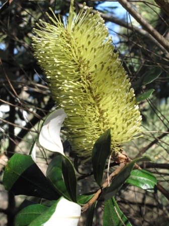 Coast Banksia is now providing honeyeaters and lorikeets with a feast . Local birds such as Little and Red Wattle Birds, White-cheeked Honeyeaters and the inescapable Noisy Miners rejoice in this Banksia. In turn they pollinate the flowers which will produce seed next summer.