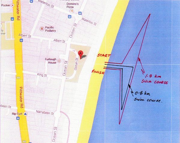 Both swims start in front of the Narrabeen Beach Surf Life Saving Club with the main event following a course in the shape of a “Marie Antoinette” champagne glass. The shorter event will follow the southern part of that course. However, the route may be altered on the day depending on conditions.