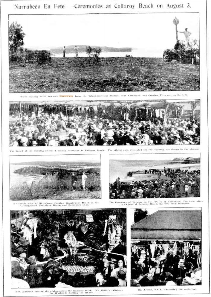 At Narrabeen a very enjoyable tea at Dr. Pope's was followed by more speechmaking, in which Mr. Stuart Robertson, Dr. Arthur, Mr. Gordon (president of the Narrabeen Progress Society), Mr. Duffy (president of the Mona Vale Progress Association), Mr. Holden, and Mr. Hughes, M.P., took part, Mr. A. Ralston was in the chair. The day's proceedings were .throughout highly successful, notwithstanding a slight rainfall, and Manly is hopeful that big legislative grants will be the upshot of the function. - Sunday Sun (Sydney, NSW : 1903 - 1910), Sunday 18 October 1908, page 1