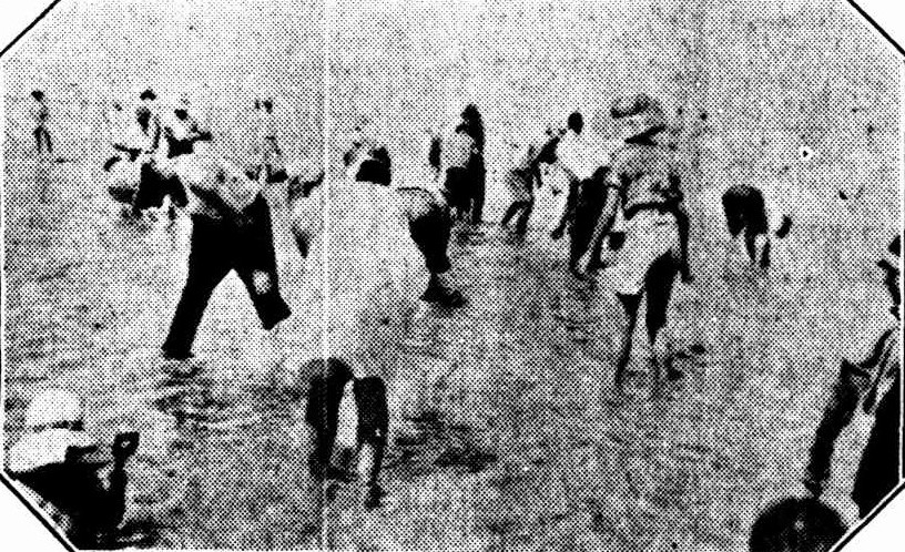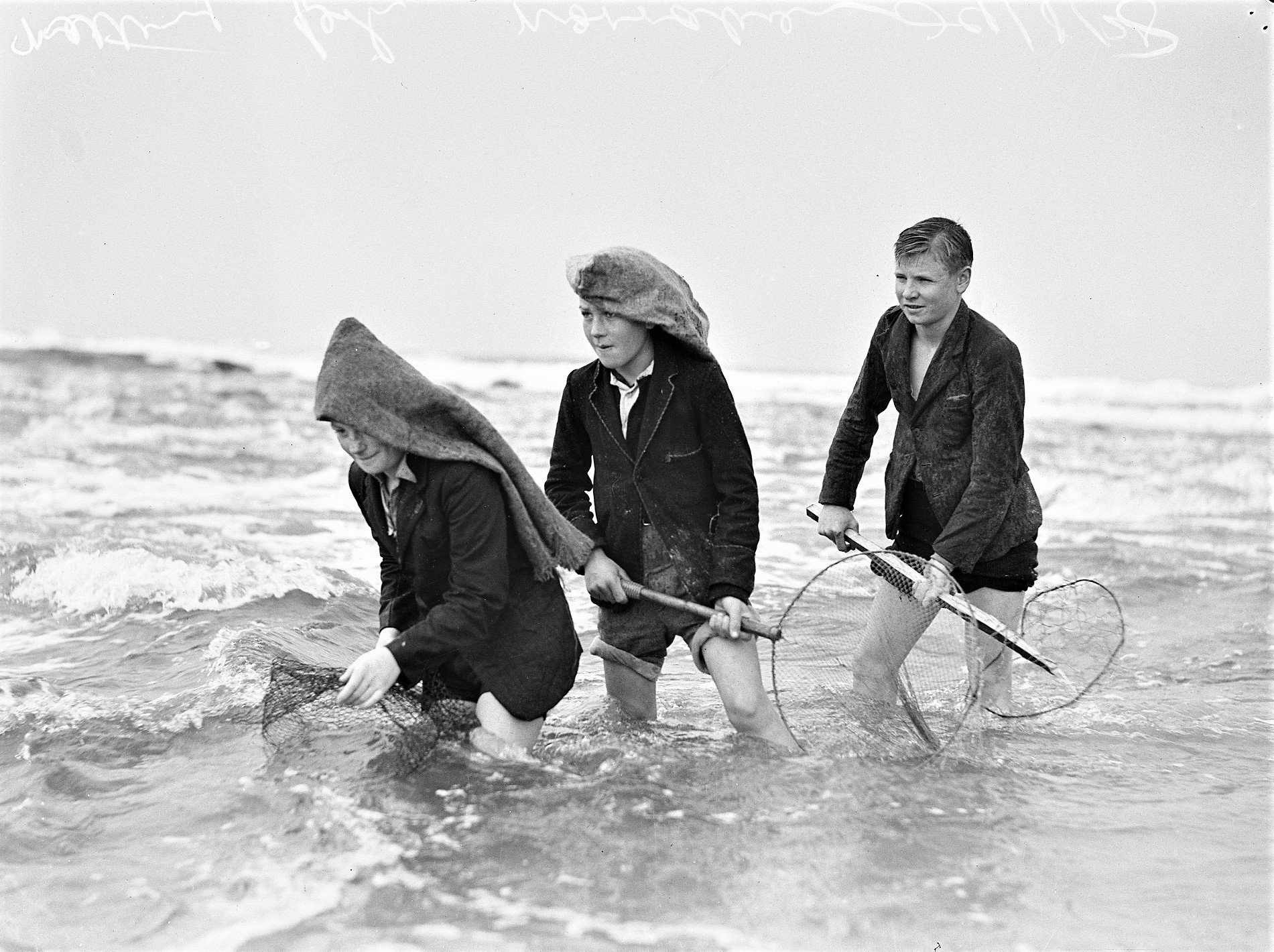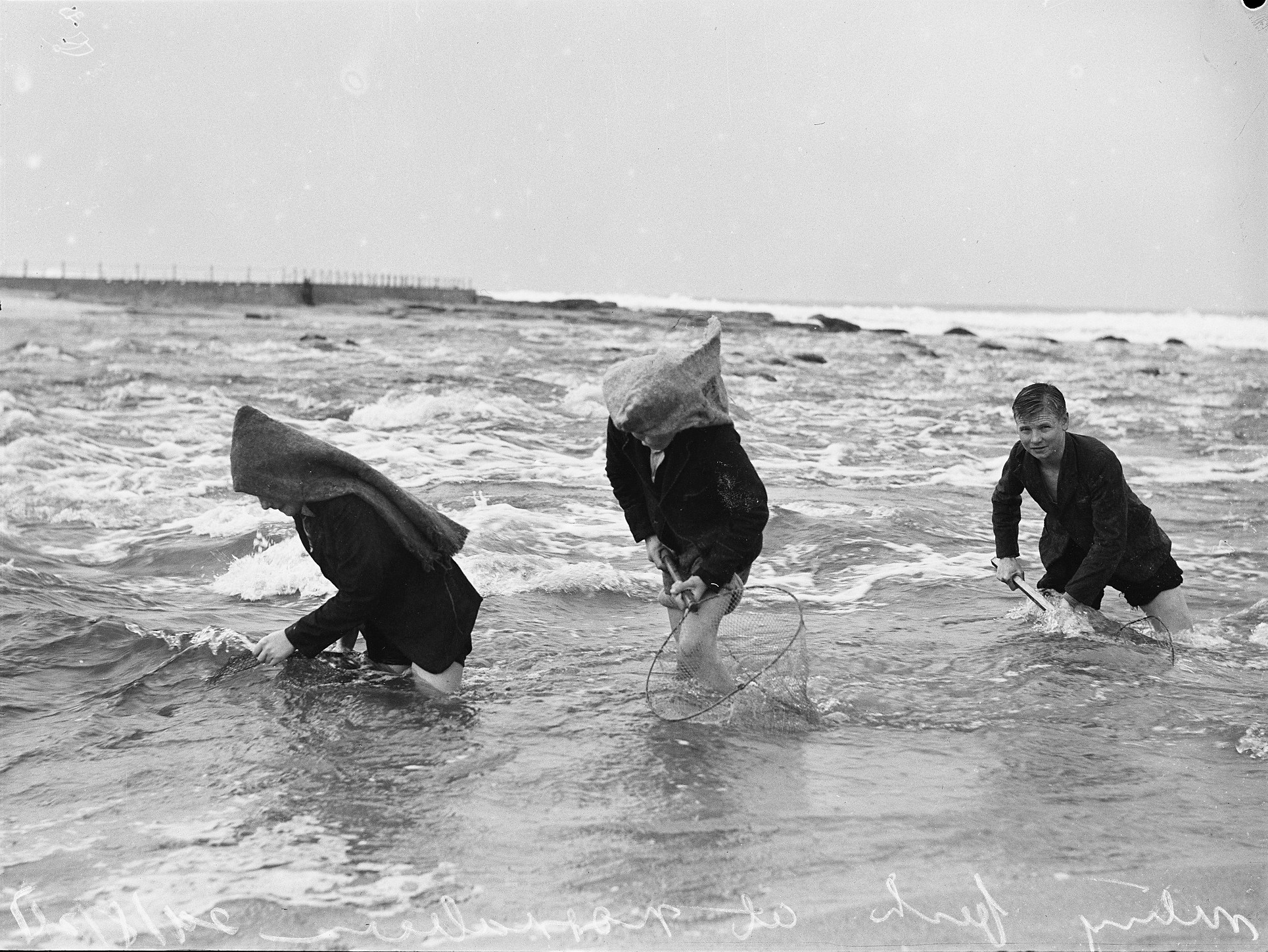 If prawns would keep, holidayers at Narrabeen would have them for tea for weeks. Last night the sand blocking the sea entrance to the lagoon was cut away to allow the surplus rain water to flow out – and with it moved the prawns – millions of them. About 200 people gathered at the entrance, and took away as many prawns as they could carry. They put them in kerosene tins and chaff bags and even took off their shirts and tied the arms and the necks up. But even with all these emergencies the crowd could not get a quarter of the prawns as they were washed past the entrance. Tons of them went straight out to sea.
