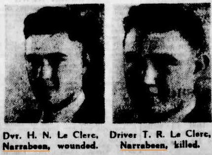 Dvr. H. N. Le Clerc. I Narrabeen, wounded. Driver T. R. Le Clerc, Narrabeen, killed. LATEST WAR CASUALTIES. (1941, July 19). The Sydney Morning Herald (NSW : 1842 - 1954), p. 12. Retrieved from http://nla.gov.au/nla.news-article17752355