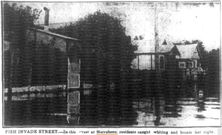 FISH INVADE STREET— In this street at Narrabeen. Residents caught whiting and bream last night - STARVED SCHOOLS— NARRABEEN FLOODS. (1927, November 28). Evening News (Sydney, NSW : 1869 - 1931), p. 13. Retrieved from http://nla.gov.au/nla.news-article118936894