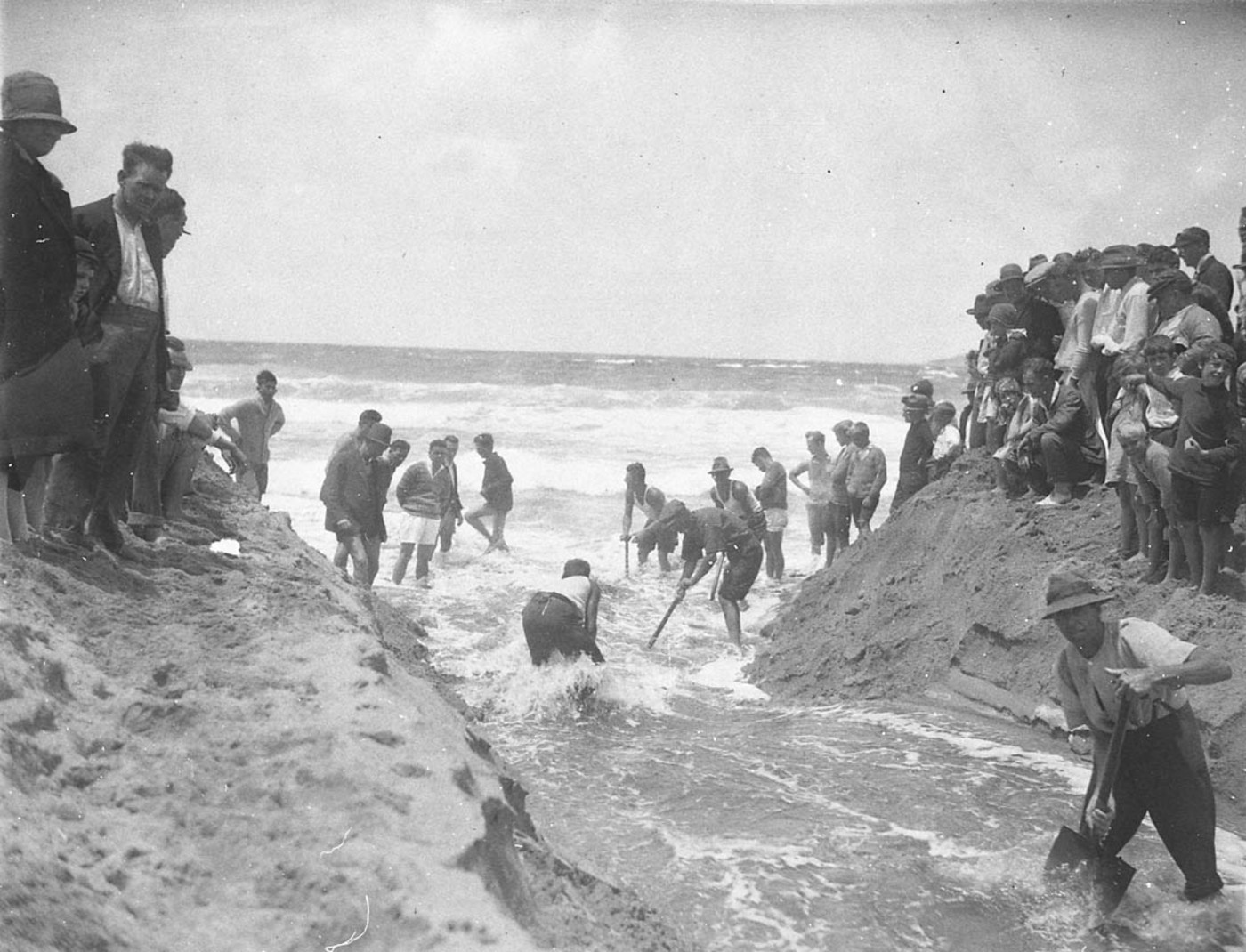Crowds around a new flood control channel from Narrabeen Lake to sea - April 1927, Image No.: hood_06408 (by Sam Hood), courtesy State Library of NSW.