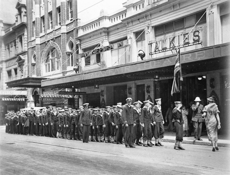 Navy League cadets marching into the Mayfair Theatre, circa 1935. Photo by Samuel Hood, Home and Away - 5967, courtesy State Library of NSW.