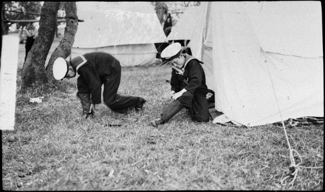 Right: Cadets at Navy League camp dressing in sailor uniforms, Long Reef (Collaroy), 1927. Photo by A J Perier, Home and Away - 34241, courtesy State Library of NSW.