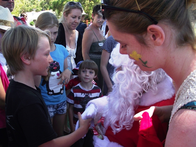 Santa has begun making his rounds of all the Christmas parties and was at the NBI Fun Day celebration on Saturday to hand out bags of lollies for all the children. A sausage sizzle, run with the help of volunteers in the Peer Support Program for teenagers, Linda and Brian, with help from Tracey, handed out hundreds of sausage sandwiches. A jumping castle, pony rides, face painting by Kookaburra volunteer Jillian, and small Christmas boxes to be decorated, with the help of Bec, also a volunteer, amused the children for hours. The pony rides were popular, as was the ‘fishing pond’ for smaller tikes.