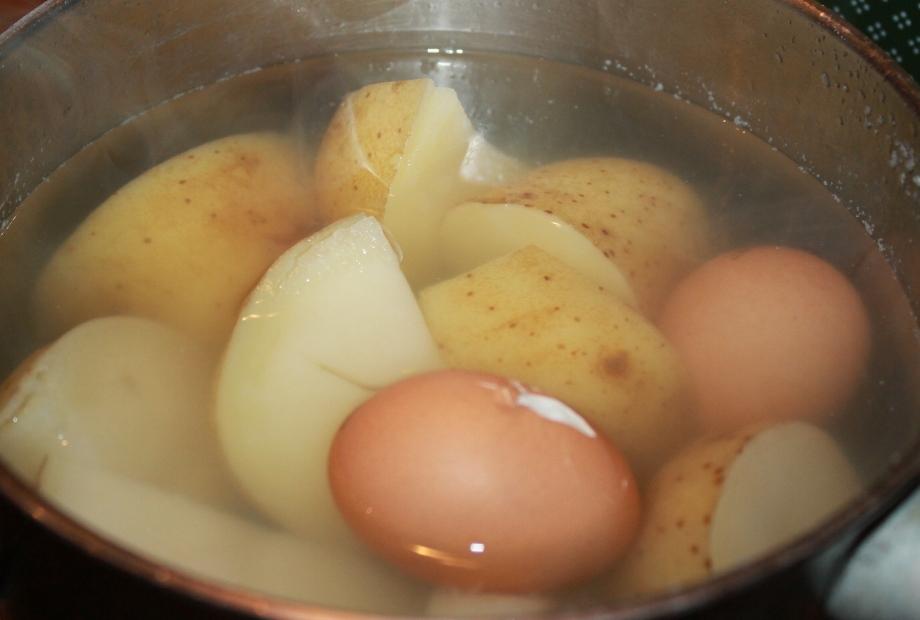 Cook the potatoes in a saucepan of boiling water for 10 minutes or until just tender. Pop the eggs in when you turn the potatoes off – the residue heat will cook them so they’re not too hard. Use a slotted spoon to transfer the potatoes to a chopping board. Halve. Add the beans to the pan and let these rest in the residue heat too. This will take away some of their crispness but still keep them bright green and with some crunch. Refresh under cold running water. Drain.