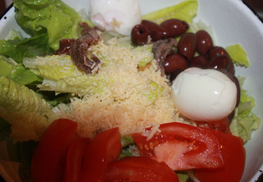 A traditional Nicoise salad usually includes raw red peppers, shallots, artichoke hearts, anchovies, boiled eggs, tomatoes and Nicoise olives and other seasonal raw vegetables, but according to many sources, excludes cooked vegetables, such as green beans and potatoes, those items in variations of salade niçoise served around the world.