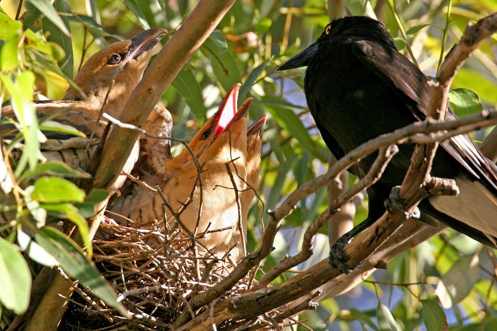 One year we had three gawky juveniles clamouring for food from their foster parents, a couple of Pied Currawongs, who looked absolutely exhausted. Not that I felt truly sorry for them, given their predatory habits on other birds. For more details go to http://www.birdsinbackyards.net/species/Scythrops-novaehollandiae