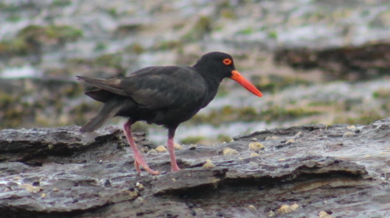 These are Sooty Oystercatchers, Haematopus fuliginosus, a Seabird classified among Australia’s Shore birds and waders species, and are a black shorebird with a long red bill, red eye and pink legs. Young birds are duller and browner. It is often seen with the similar Pied Oystercatcher and they are Australia’s only all-black seabird and is found only found in coastal areas. The Sooty Oystercatcher is strictly coastal, usually within 50 m of the ocean. It prefers rocky shores, but will be seen on coral reefs or sandy beaches near mudflats. It breeds on offshore islands and isolated rocky headlands.