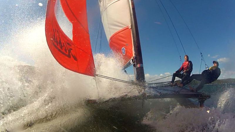 Speed was the theme of the day on Sunday and this shot of Peter Salter and Brendan Southey taken from the front of their Hobie 16 shows the starboard hull almost totally underwater as they punch through the conditions reaching speeds in excess of 21knts. Pity this was taken before racing started and despite a couple of capsizes they still managed a solid mid field place at the end of the regatta.