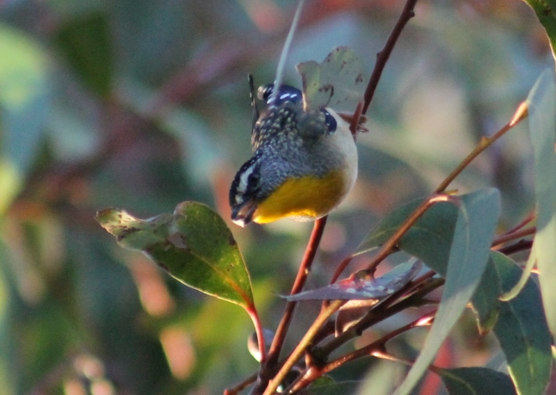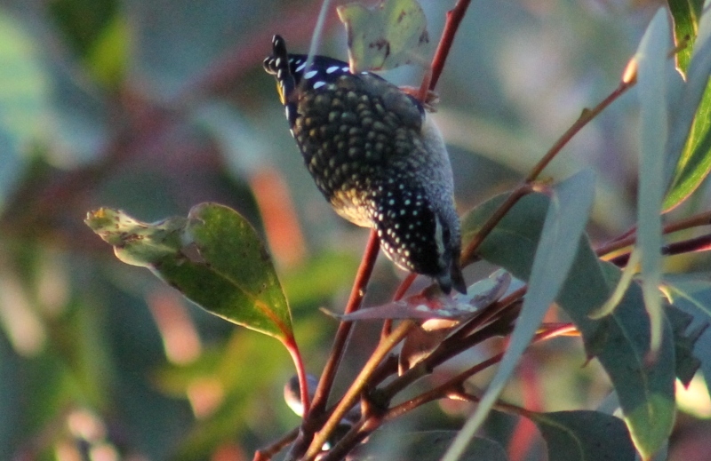 The Spotted Pardalote is a tiny bird that is most often high in a eucalypt canopy, so it is more often detected by its characteristic call. The wings, tail and head of the male are black and covered with small, distinct white spots. Males have a pale eyebrow, a yellow throat and a red rump. Females are similar but have less-distinct markings. The Spotted Pardalote uses a tunnel built in clay or soil that ends in a lined chamber, and may ignore the approach of birders. This one photographed this week seemed as curious about the birder as she was of him. Both parents share nest-building, incubation of the eggs and feeding of the young when they hatch.