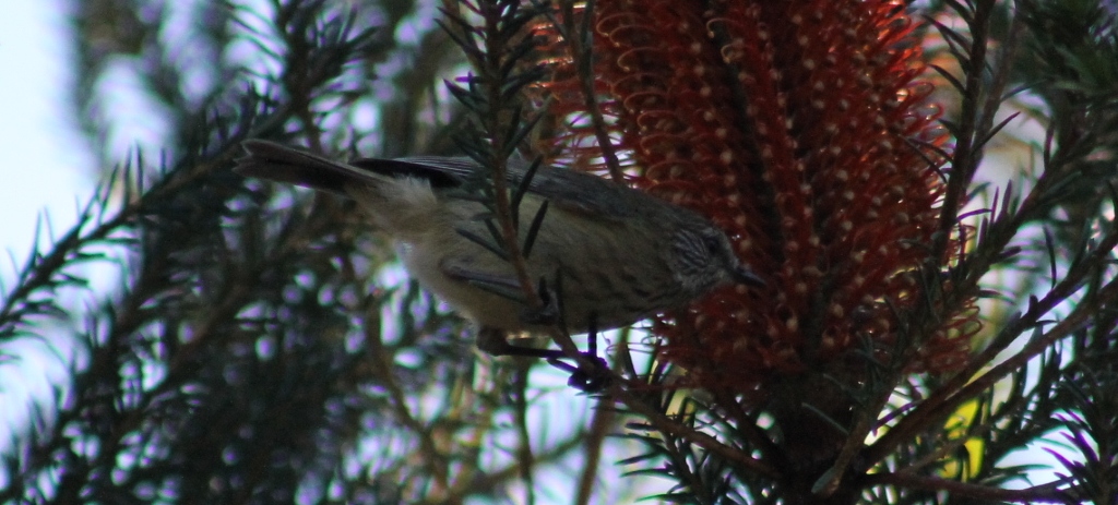 The Striated Thornbill can be distinguished from the similarly sized and shaped Brown Thornbill, A. pusilla, by its orange-brown cap streaked with white and by black streaking on its yellow-white underparts. In January this year we brought you a page of those Brown Thornbills found happy in the trees beside the yellow brick road at Avalon. It also has a thinner, higher pitched call than the Brown Thornbill and is more commonly found higher in trees. The Striated Thornbill pictured here was photographed at Ingleside and is found only in the south-eastern mainland of Australia from southern Queensland to eastern South Australia.