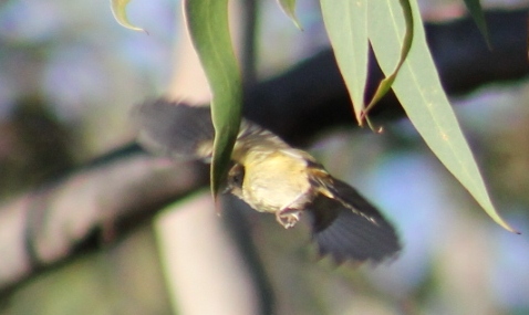 As shown here, the Spotted Pardalote forages on the foliage of trees for insects, especially psyllids, and sugary exudates from leaves and psyllids. The Spotted Pardalote remains relatively common in urban areas that have a high density of eucalypts. Nests have sometimes been found in carpet rolls and garage roll-a-doors. (2.)