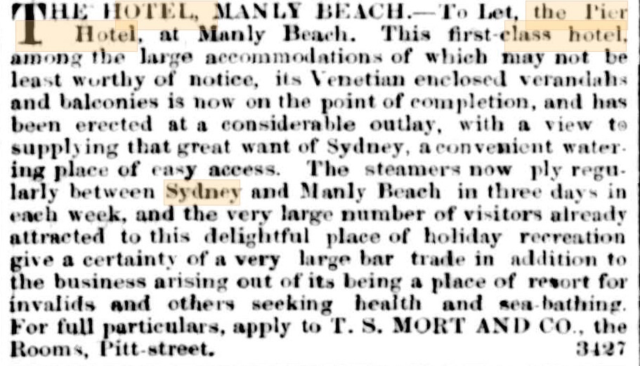 MANLY BEACH QUEEN'S BIRTHDAY REGATTA. - Mr. J. T. Grocott, the successor of Mr. Philip Cohen, in the Pier Hotel, at Manly Beach, is duly evidencing his resolve to multiply the attractions of this picturesque locality. Unrivalled in situation, and commanding two sea views, the one of our beautiful harbour, and the other the open ocean, its claims to take precedence of the various marine retreats in and about Port Jackson can scarcely be disputed. To insure this, the management of the Hotel in a manner satisfactory to the public, is absolutely indispensable, and we believe that Mr. Grocott is fully impressed with this requirement. No title (1859, May 14). Bell's Life in Sydney and Sporting Reviewer (NSW : 1845 - 1860), p. 2. Retrieved from http://nla.gov.au/nla.news-article59870603