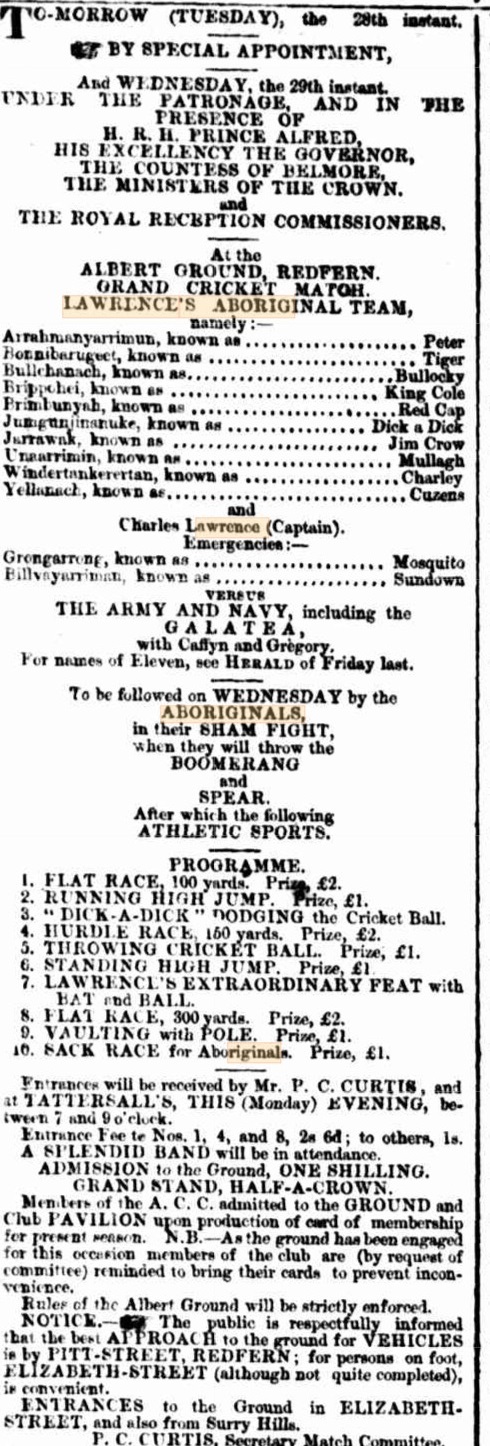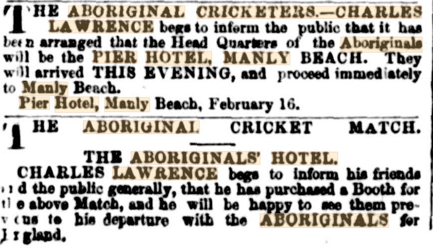The effort made to secure the services of Mr Charles Lawrence, one of the original All England Eleven, to captain the team, has been successful, and he left Sydney for Lake Wallace (in Victoria), in July last. The care taken of the blacks by him when they were under his hostelry at Manly Beach, created a favorable impression on the minds of the aborigines and though several fresh men are now introduced, Mr Lawrence has them all under perfect control, and with the aid of Mr W. R. Hayman, who proceeds to England to assist in all matters connected with the affair, they appear like a happy travelling family. The high character borne by Mr Lawrence not only as a good cricketer, but in his social capacity, is a sufficient guarantee that his charge will be well cared for ; and as he has determined to return to the colonies himself, in company with Mr Hayman, he will bring back our sable brethren with hard-earned laurels ; for, if the blacks do not succeed in beating English cricketers, they will certainly astonish Britain in their other games, such as throwing the boomerang, spears and cricket ball, also in running, jumping, &c.