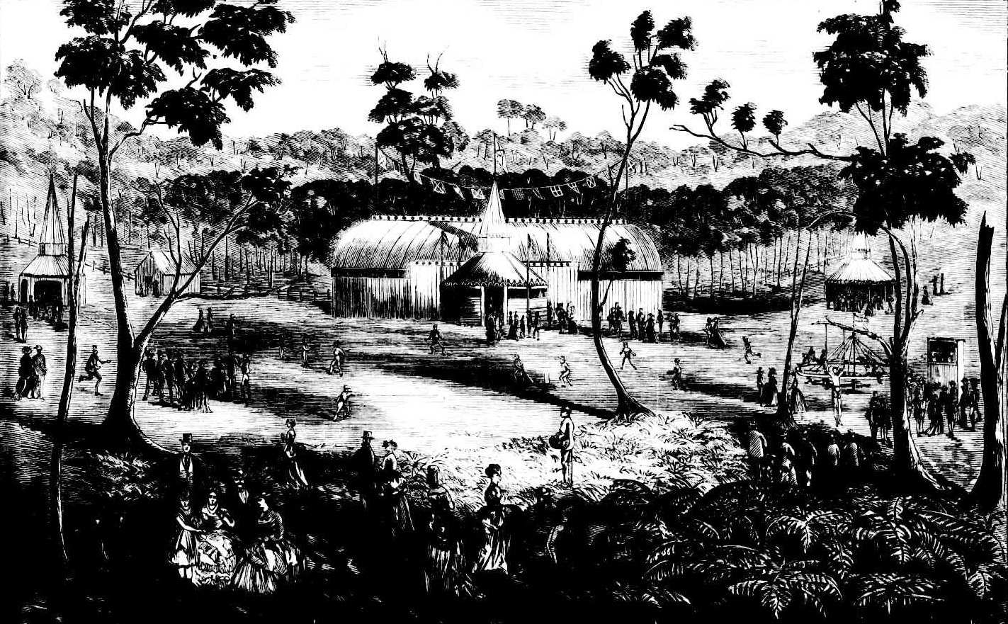 Sketch from Manly Wildflowers Show of September 1883 - report shows the pavilion and original hotel in Ivanhoe Park, Manly